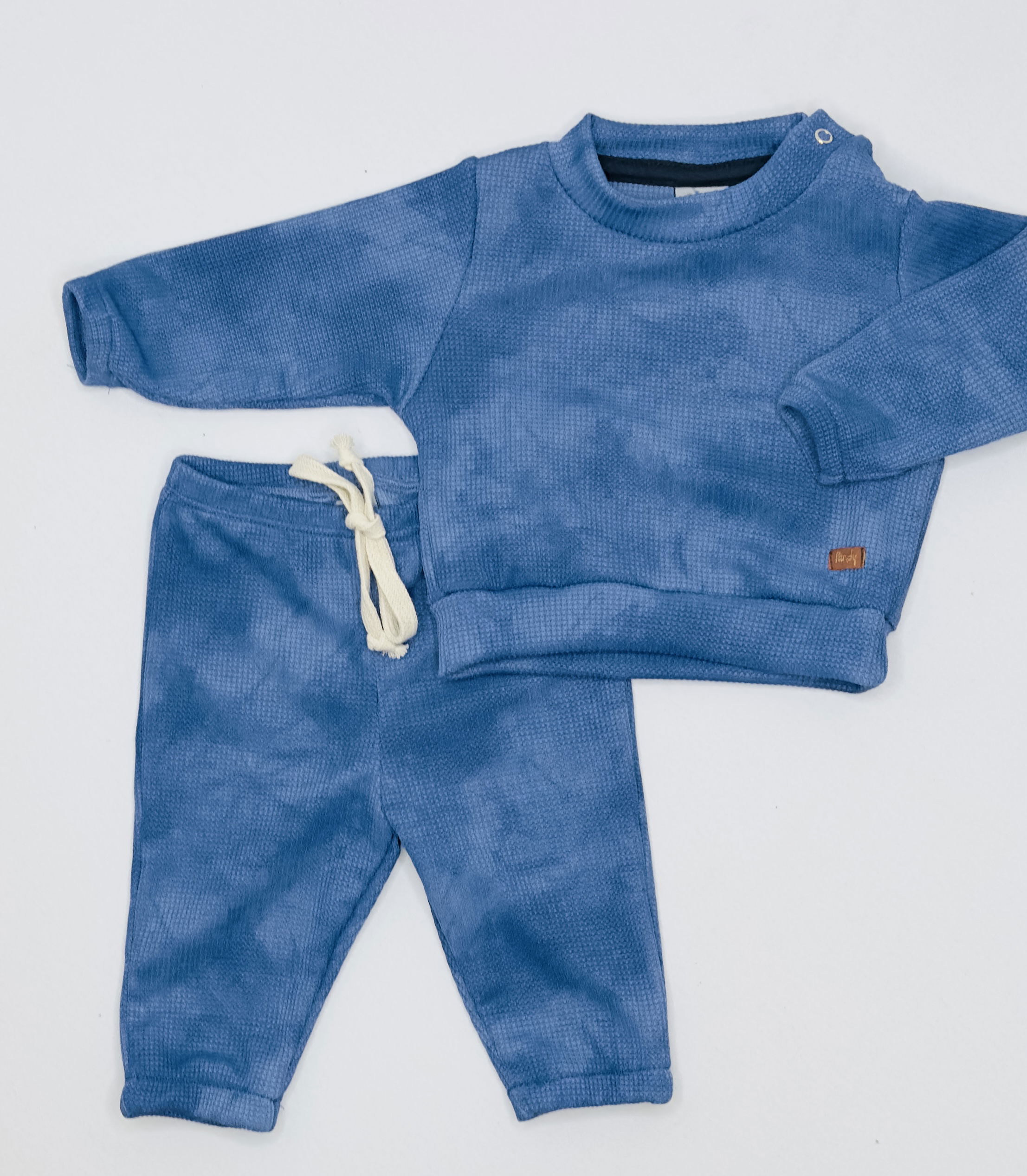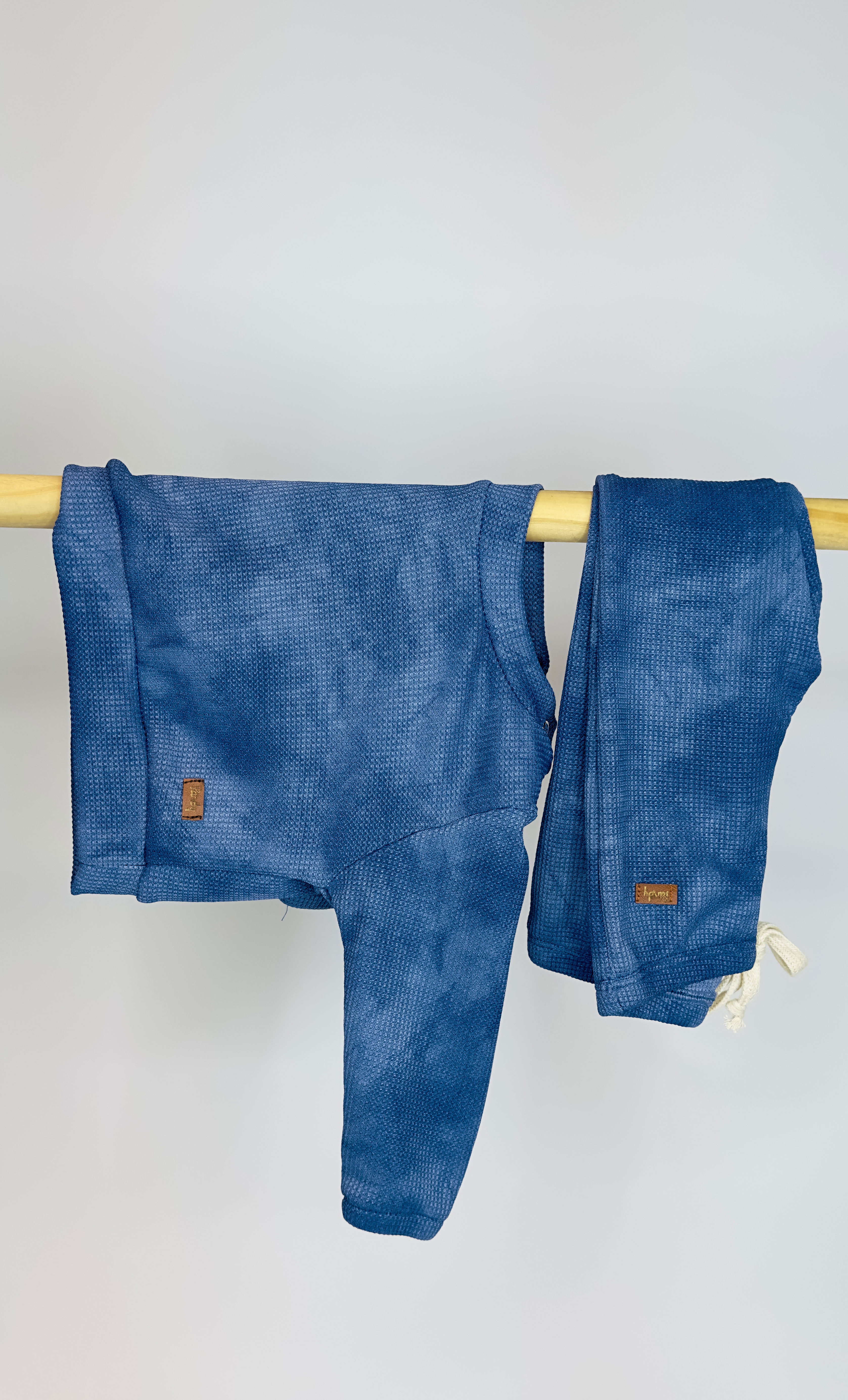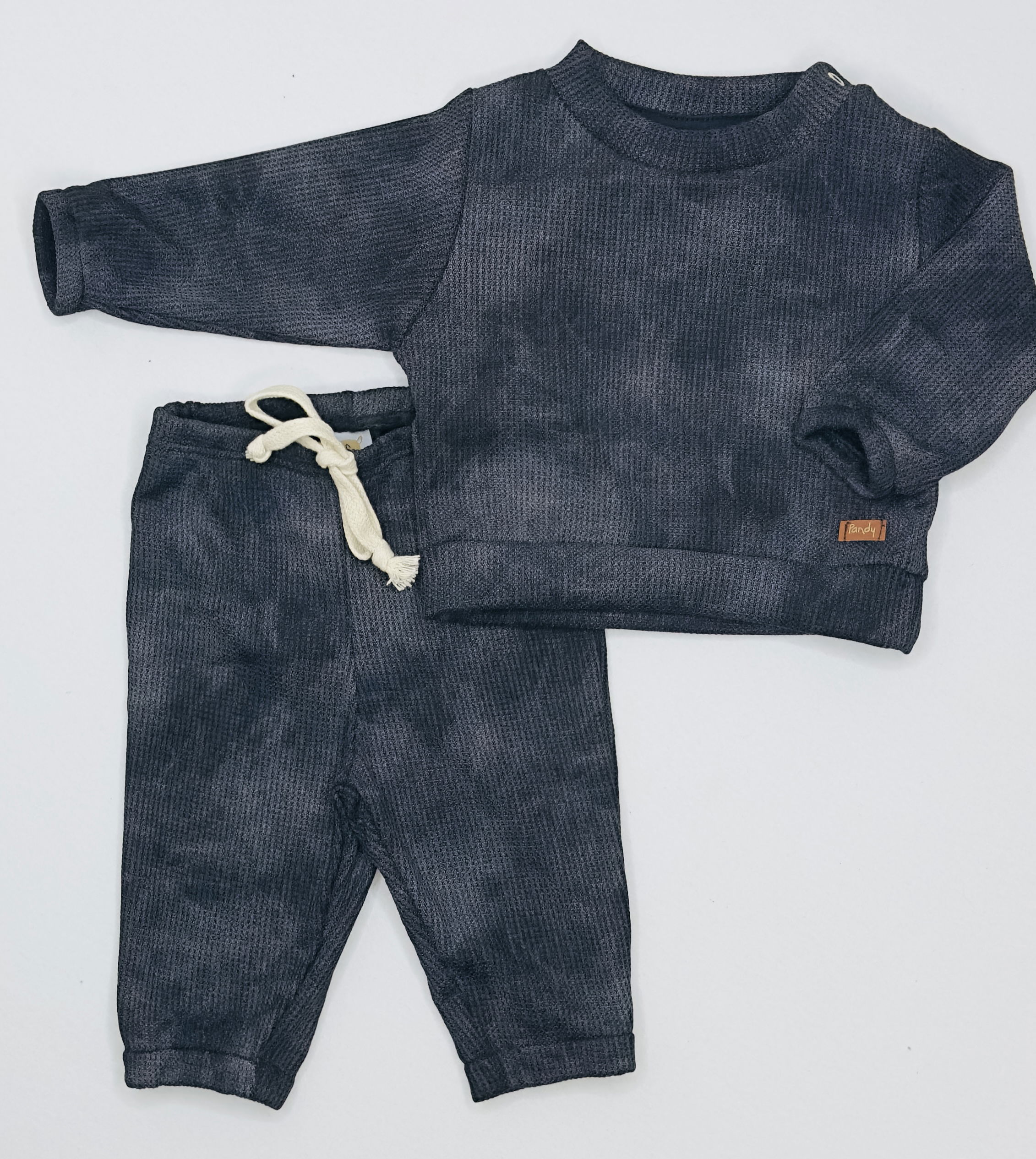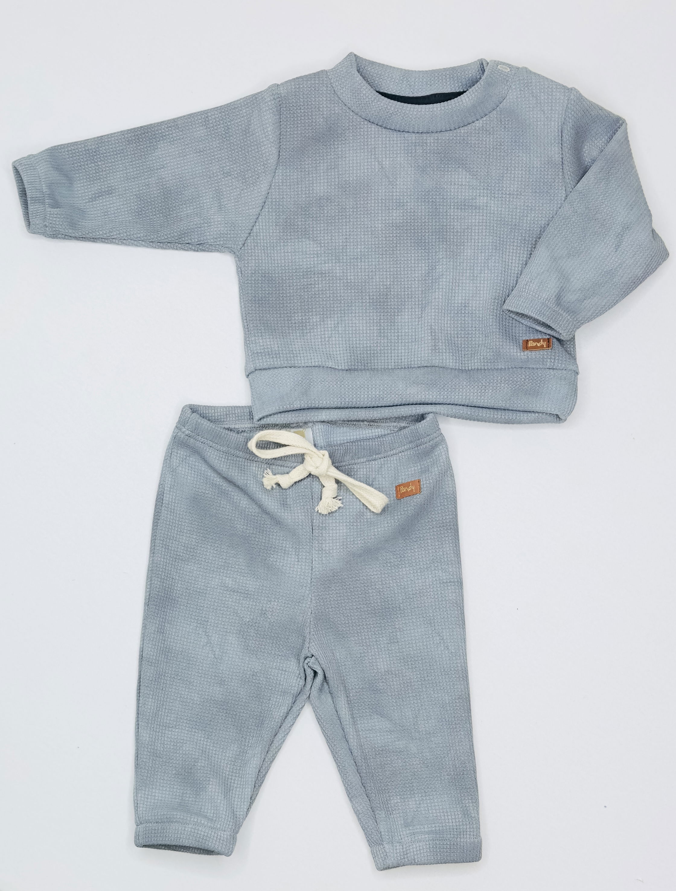 Conjunto MINIMO de waffle estampado. Pantalon y buzo a la base con broches en hombro.