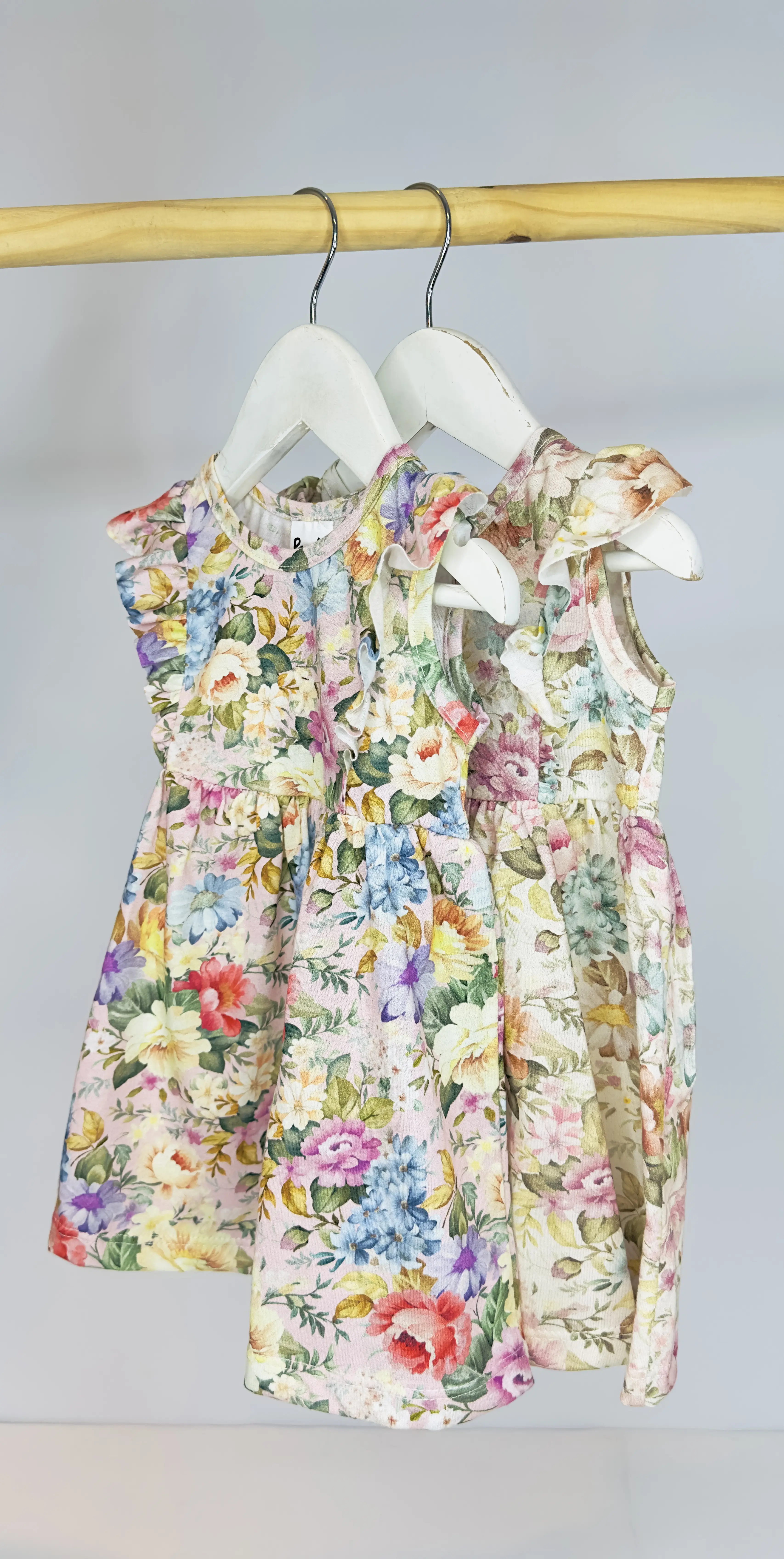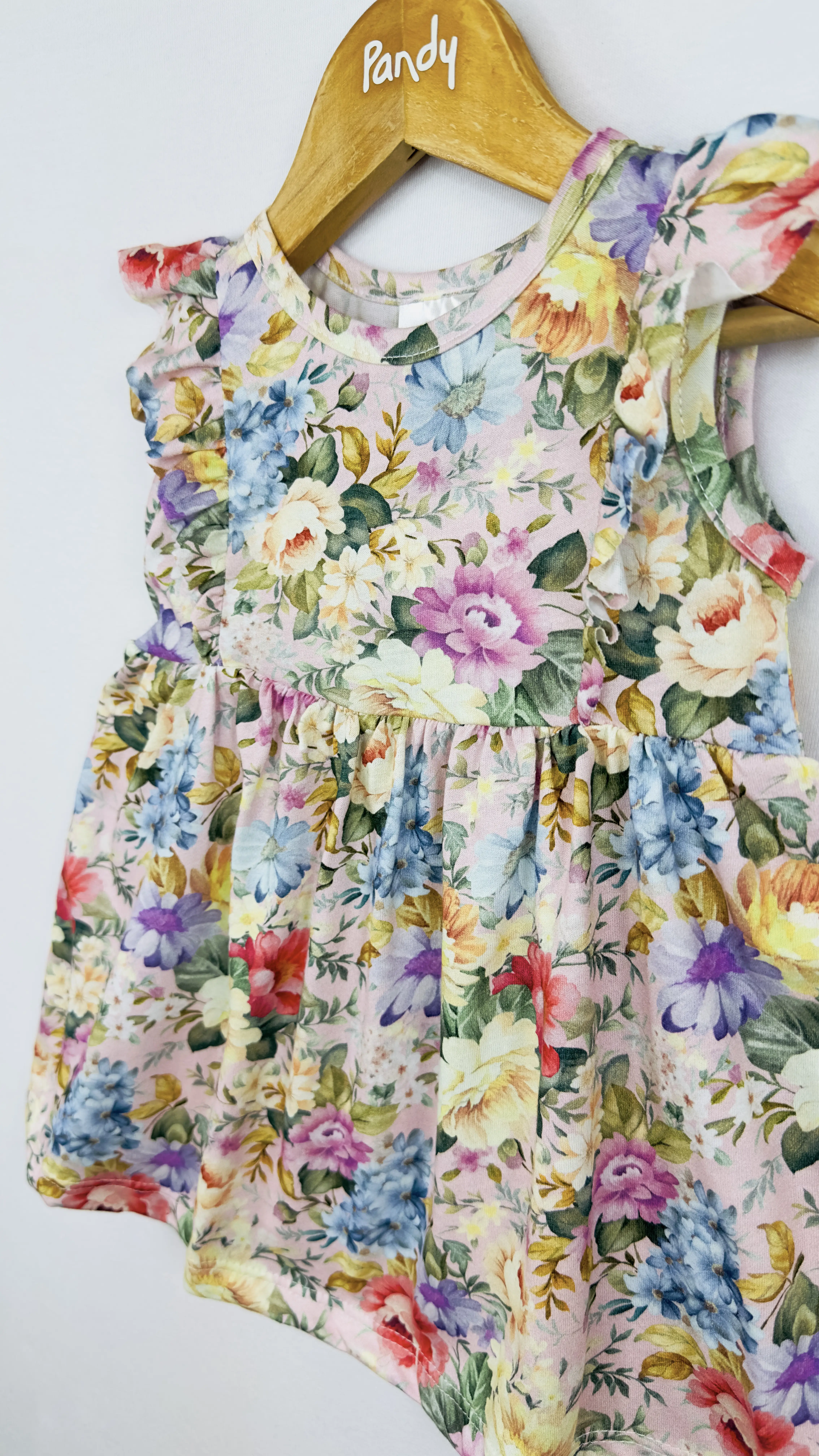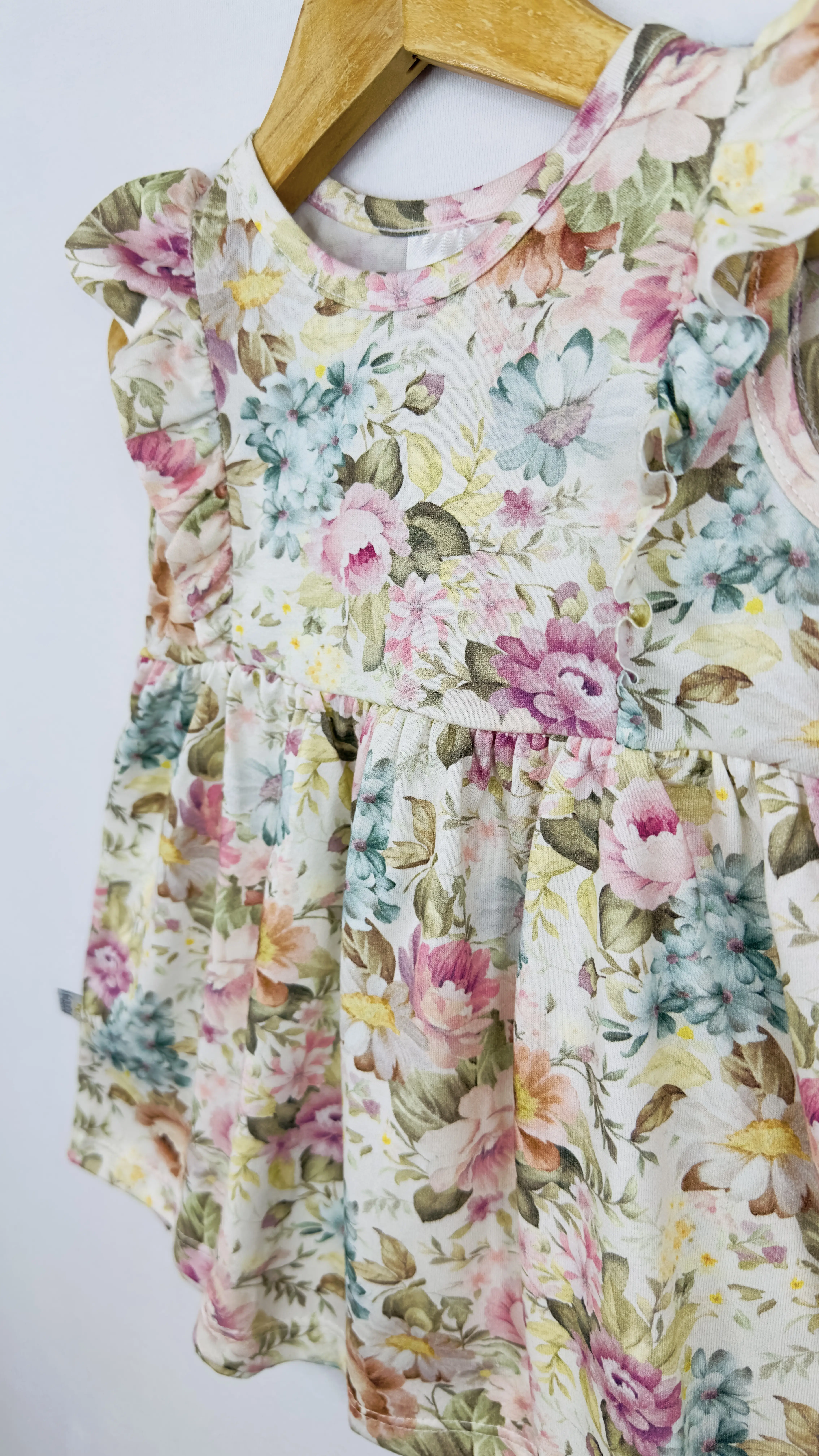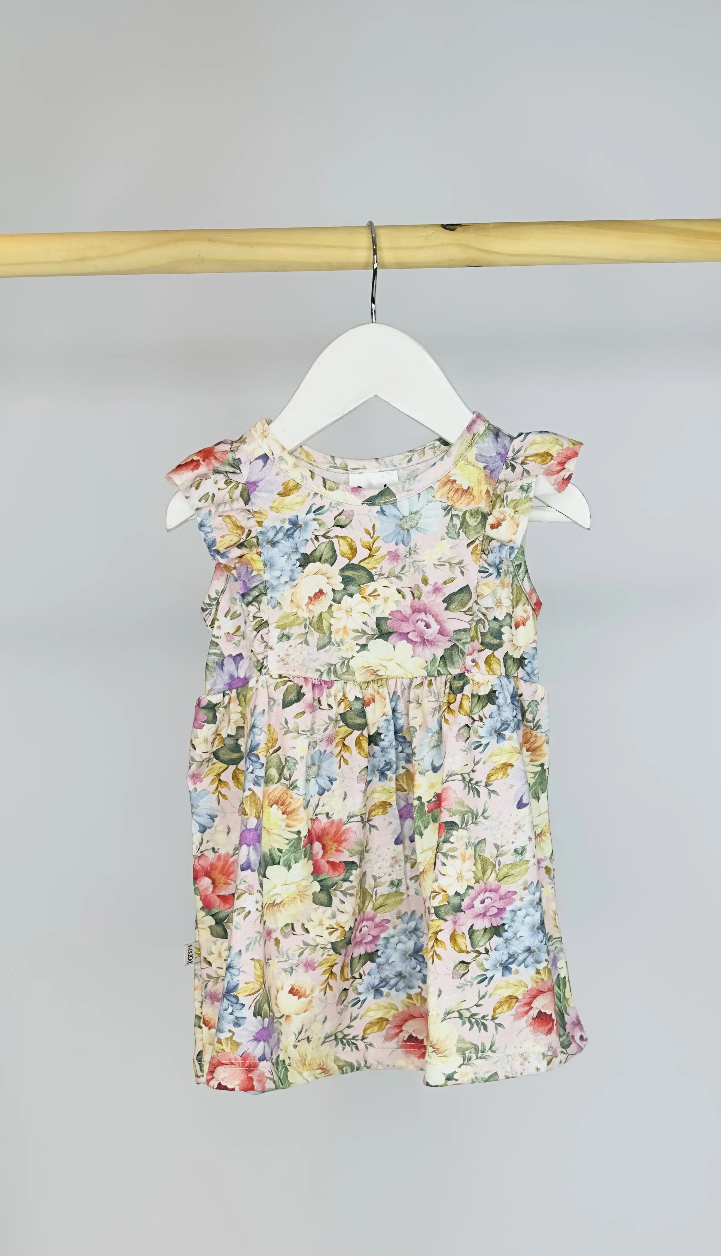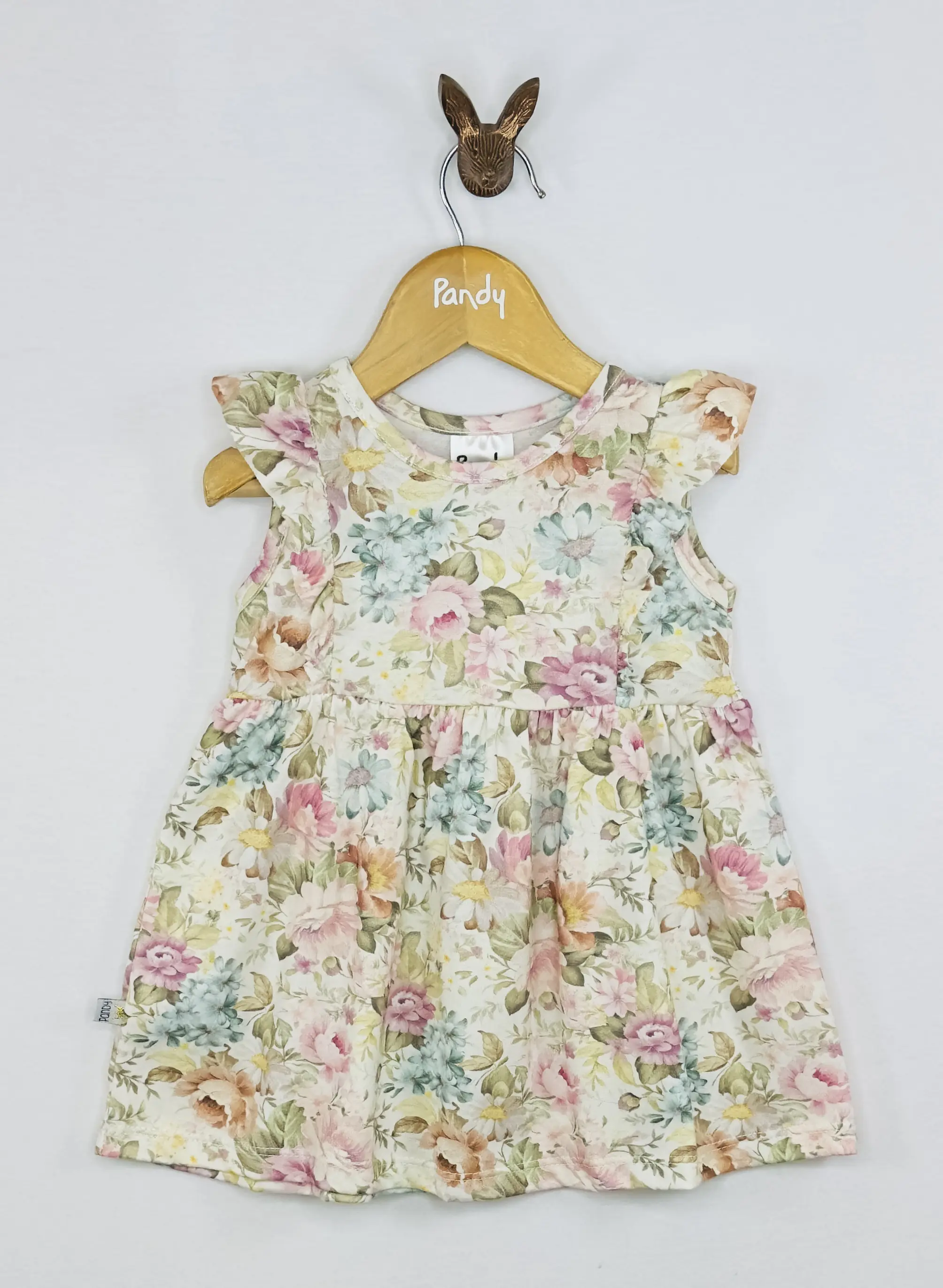 Vestido beba jersey 100% algodón estampado con volados en las mangas.