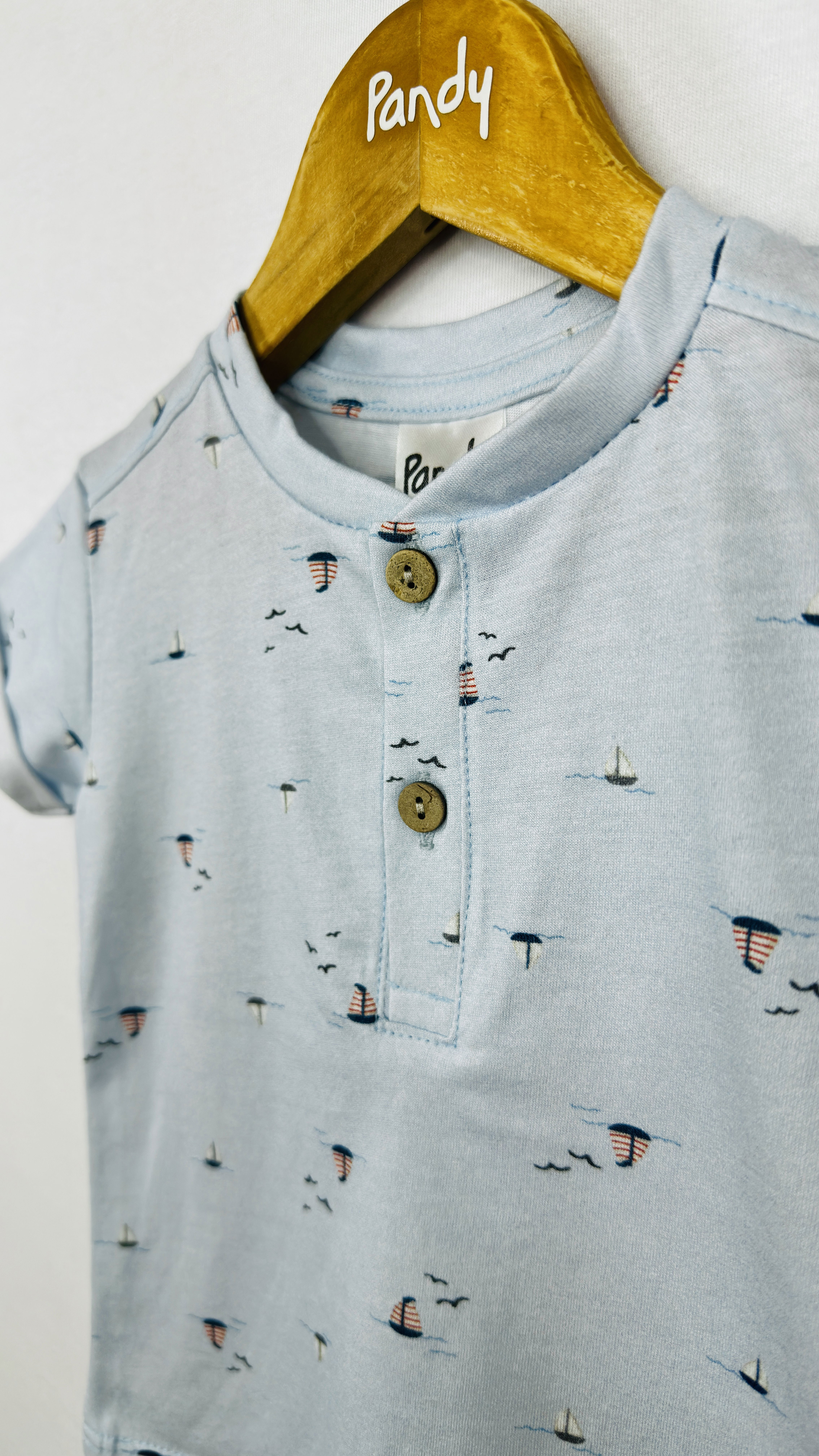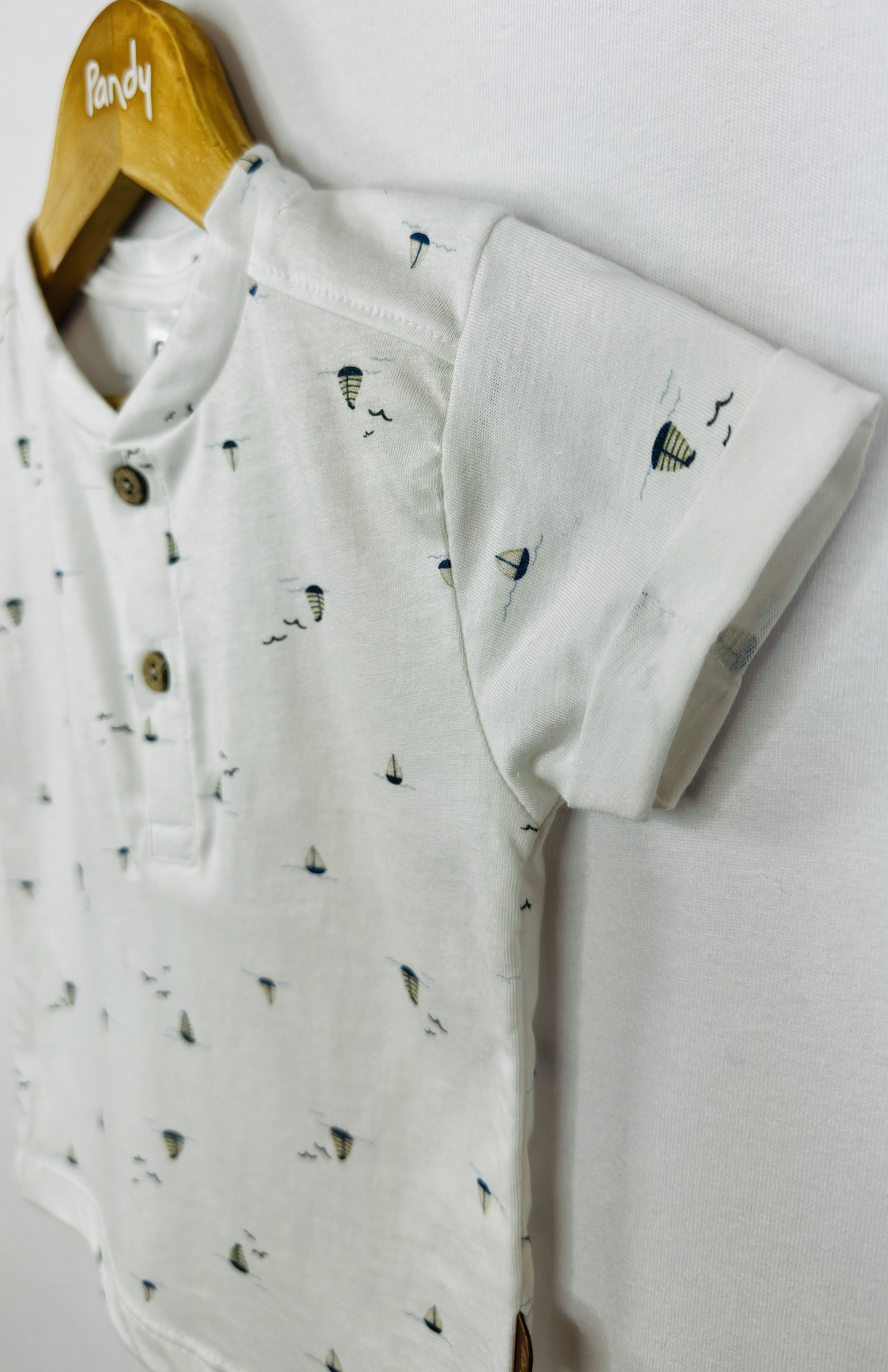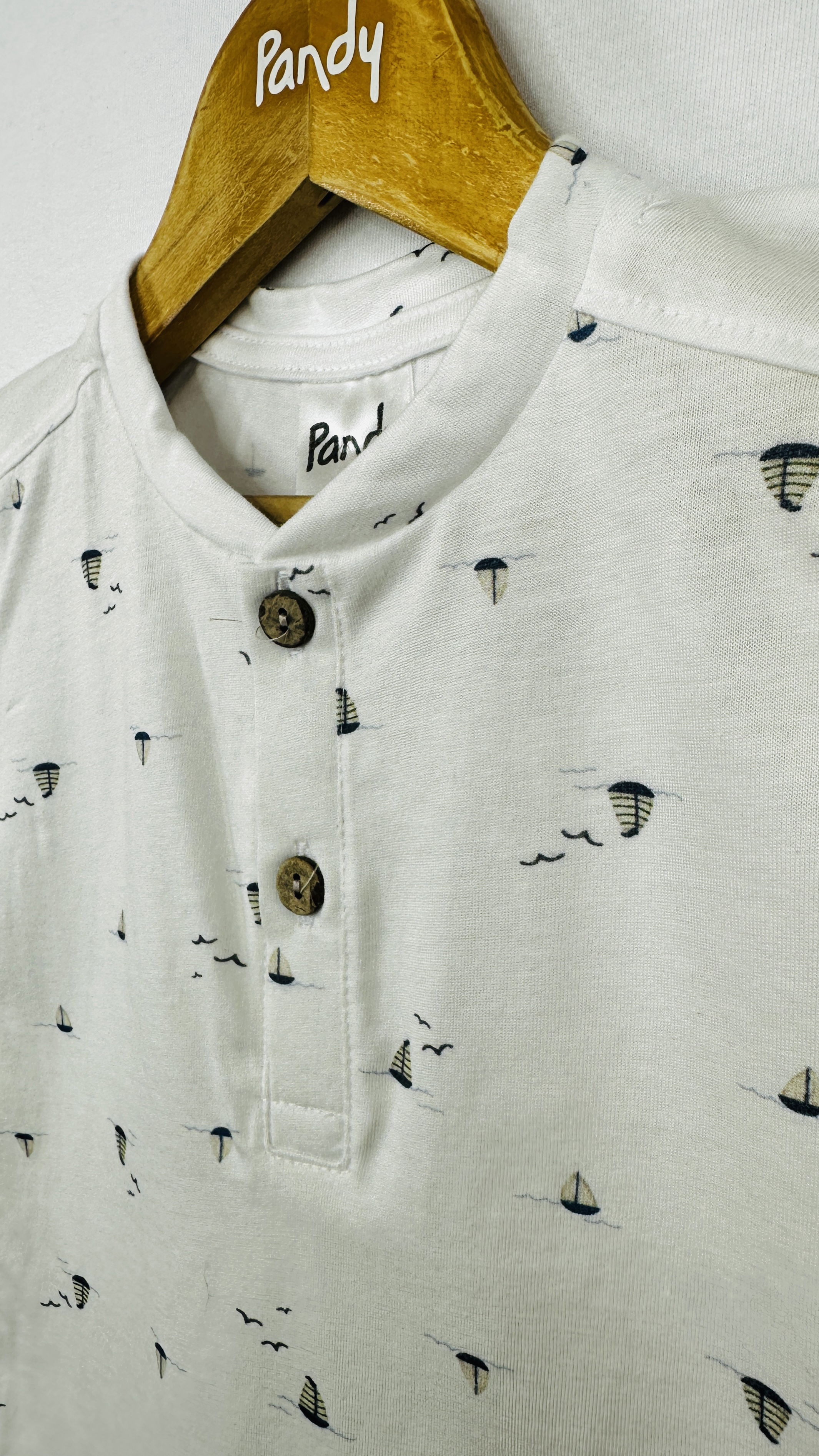 Remera bebe jersey estampado, con cartera y botones simil madera, detelle en manga, dobladillo con atraque.